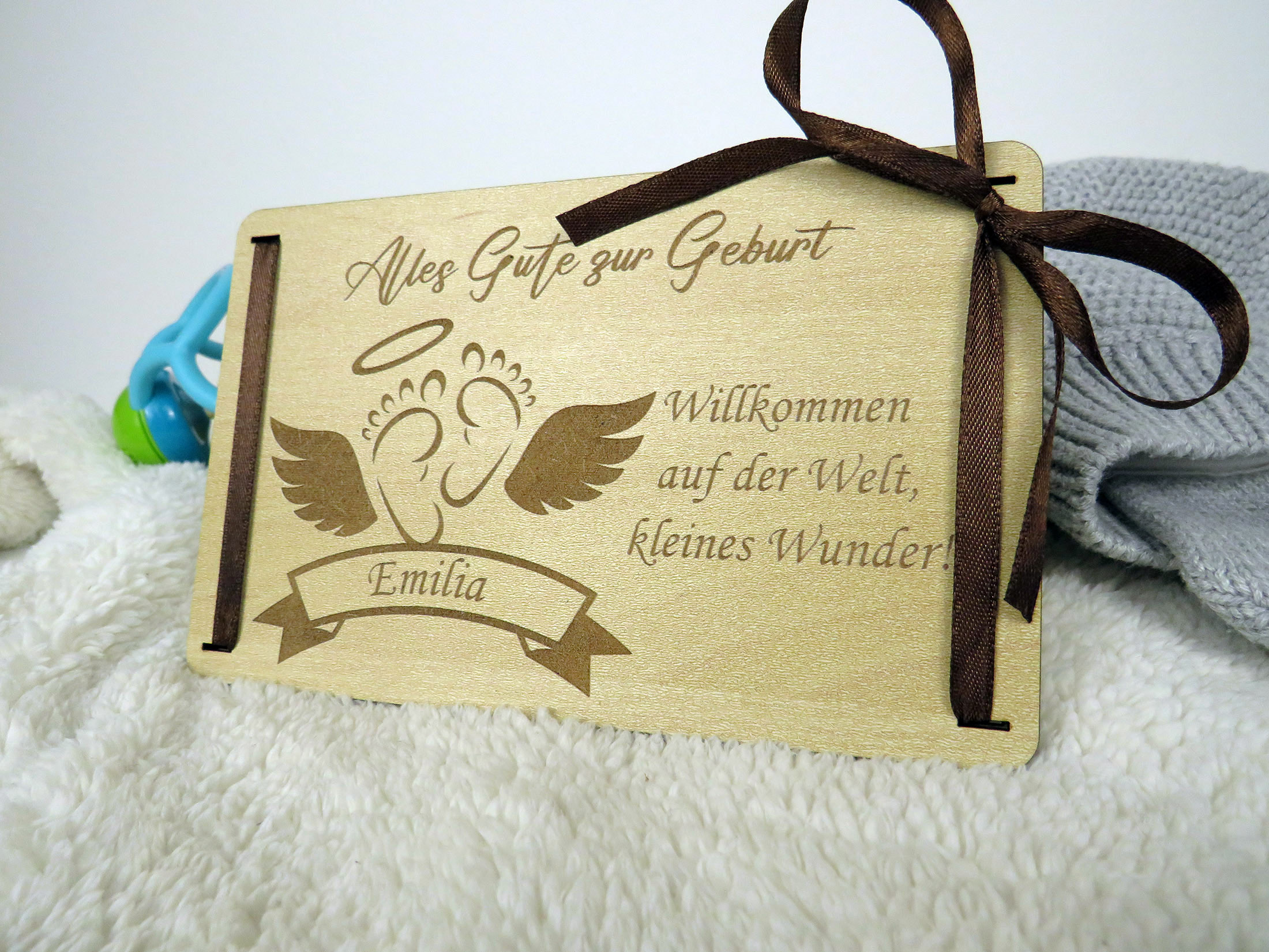Feiern Sie die Ankunft eines neuen Lebens mit unserer exquisiten personalisierten Holzkarte zur Geburt eines Babys. Diese einzigartige Karte, aus Holz gefertigt, vereint natürliche Eleganz mit einer persönlichen Note und ist das perfekte Geschenk für frischgebackene Eltern.