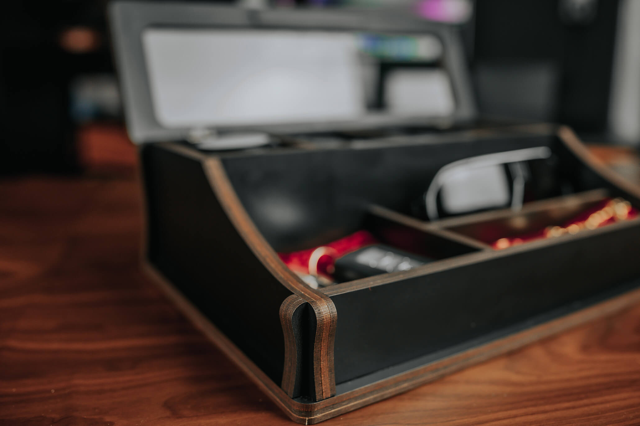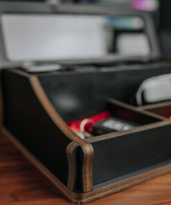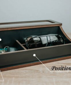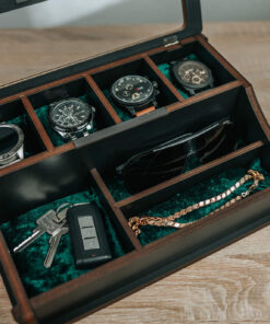 Die elegant kombinierte Box wurde entworfen, um Ihre vier Lieblingsuhren an einem sicheren Ort aufzubewahren, geschützt vor Staub und Kratzern. Sorgfältig genähte Kissen im Inneren der Box schützen Ihre Gegenstände vor Beschädigungen. Neben Platz für vier Uhren verfügt die kombinierte Box über drei weitere Fächer für Dinge, die Sie griffbereit haben möchten, sei es Brillen, Schmuck, Schlüssel oder etwas anderes – alles ist gleich wichtig. Jede Box wird von Hand bearbeitet, was sie einzigartig macht.Eine Personalisierungsoption ist verfügbar. Sie können die Schriftart für den Text, die Farbe der kombinierten Box und die Farbe der Kissen nach Ihrem Geschmack auswählen.